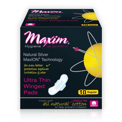 Maxim Hygine, 100% 천연 코튼 네추럴 실버 맥스이온 울트라 씬 날개형 Regular, 10 개